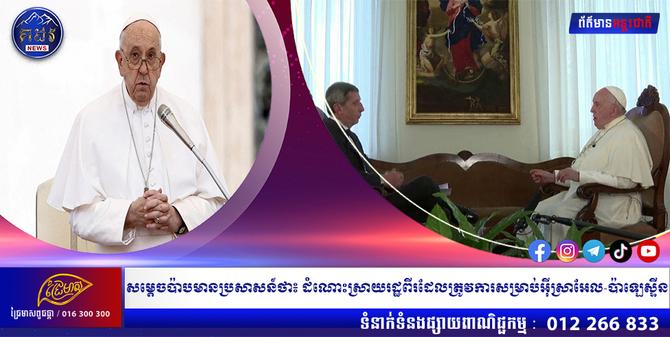 សម្តេចប៉ាប ហ្វ្រង់ស៊ីស បាននិយាយកាលពីថ្ងៃពុធថា ដំណោះស្រាយរដ្ឋពីរគឺចាំបាច់សម្រាប់អ៊ីស្រាអែល និងប៉ាឡេស្ទីន ដើម្បីបញ្ចប់សង្រ្គាមដូចបច្ចុប្បន្ន និងបានអំពាវនាវឱ្យមានឋានៈពិសេសសម្រាប់ក្រុងហ្សេរុយសាឡឹម។