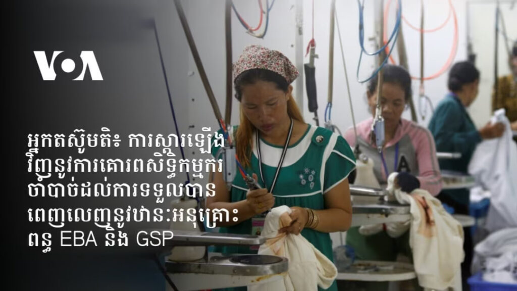 -(VOAថ្ងៃទី១៤ខែកុម្ភៈ) ការធ្វើឲ្យប្រសើរវិញនូវការគោរពសិទ្ធិកម្មករ និងការផ្ដល់ឲ្យសហជីពឯករាជ្យ នូវសិទ្ធិ សេរីភាពដើម្បីការពារប្រយោជន៍កម្មករជាចំណុចស្នូលសម្រាប់កម្ពុជា ក្នុងការទទួលបានត្រឡប់មកវិញនូវឋានៈ អនុគ្រោះពន្ធពេញលេញរបស់សហភាពអឺរ៉ុបគឺ «គ្រប់មុខទំនិញលើកលែងតែសព្វាវុធ» ហៅកាត់ថា EBA និងប្រព័ន្ធ អនុគ្រោះពន្ធទូទៅរបស់សហរដ្ឋអាមេរិកហៅកាត់ថា GSP។ ជុំវិញរឿងនេះ អ្នកនាំពាក្យក្រសួងការងារ និងបណ្តុះប ណ្តាលវិជ្ជាជីវៈលោក កត្តា អ៊ន ច្រានចោលការលើកឡើងរបស់សង្គមស៊ីវិល ដែលធ្វើការតស៊ូមតិក្នុងវិស័យការងារពាក់ ព័ន្ធនឹងការរឹតត្បិតសិទ្ធិសហជីព ដោយថា កម្ពុជាជាទីដែលមានលម្អសេរីភាពយ៉ាងទូលំទូលាយសម្រាប់សហជីពដែល ត្រូវតែអនុវត្តសិទ្ធិអំណាចរបស់ខ្លួនទៅតាមច្បាប់ស្តីពីការងារ និងសហជីព ។