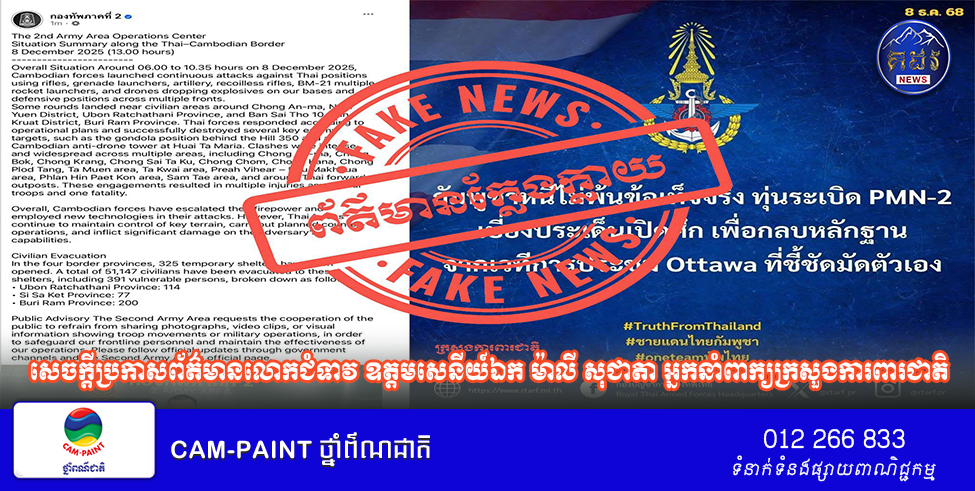 ក្រសួងការពារជាតិ នៃព្រះរាជាណាចក្រកម្ពុជា សូមជម្រាបជូនសាធារណជន អ្នកសារព័ត៌មានជាតិ និងអន្តរជាតិមេត្តាជ្រាបថា៖ នៅរសៀលថ្ងៃទី៨ ខែធ្នូ ឆ្នាំ២០២៥នេះ ក្រសួងការពារជាតិ នៃព្រះរាជាណាចក្រកម្ពុជា បានកត់សម្គាល់បន្ថែមថា ផេកផ្លូវការរបស់កងទ័ពថៃមានភាពសកម្មក្នុងការផ្សព្វផ្សាយព័ត៌មានក្លែងក្លាយជាបន្តបន្ទាប់ដែលខុសស្រឡះពីការពិត ដោយបានចុះផ្សាយថា ”កម្ពុជាបានចល័តសព្វាវុធធុនធ្ងន់នៅតាមបណ្តោយព្រំដែនកម្ពុជា-ថៃ” ហើយត្រូវបានបណ្តាញសារព័ត៌មានរបស់ថៃមួយចំនួនបានដកស្រង់ និងចេញផ្សាយជាបន្តបន្ទាប់ ក្នុងចេតនាបំភ័ន្តសាធារណមតិជាតិ និងអន្តរជាតិ និងយកមកធ្វើជាលេសដើម្បីបង្កឱ្យមានភាពតានតឹងផ្នែកយោធាជាមួយកម្ពុជាឡើងវិញ ។