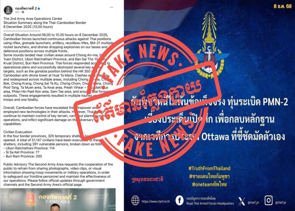 The Ministry of National Defence of the Kingdom of Cambodia would like to inform the public, as well as national and international journalists that, on 8 December, 2025 the Ministry noted that the official page of the Thai Army was actively spreading false information that clearly contradicted the truth by publishing claims that “Cambodia has moved heavy and destructive weapons and equipments along the Cambodian–Thailand border.” This misinformation was subsequently quoted and republished by some Thai media outlets with the intention of misleading national and international public opinion and using it as a pretext to re-escalate military tensions with Cambodia.