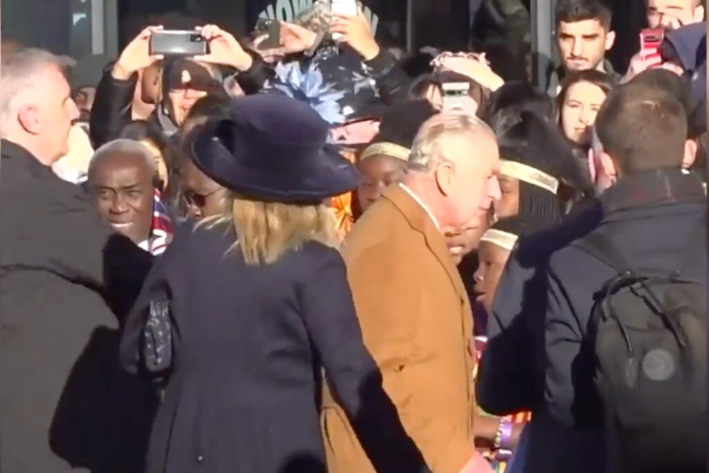 សន្តិសុខបាននាំព្រះមហាក្សត្រ ចេញឆ្ងាយពីហ្វូងមនុស្សនៅខាងក្រៅសាលាក្រុង ប៉ុន្តែនៅតែបន្តចាប់ដៃជាមួយសាធារណជន នៅកន្លែងផ្សេង។