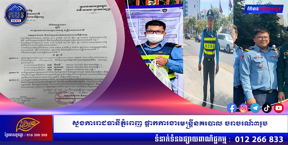 លោកឧត្ដមសេនីយ៍ឯក ស ថេត អគ្គស្នងការរង និងជាស្នងការនៃស្នងការដ្ឋាននគរបាលរាជធានីភ្នំពេញ បានសម្រេចផ្អាកការងារជាបណ្ដោះអាសន្នមន្ត្រីនគរបាលចំនួន៣រូប ចំណុះការិយាល័យនគរបាលចរាចរណ៍ផ្លូវគោក។
