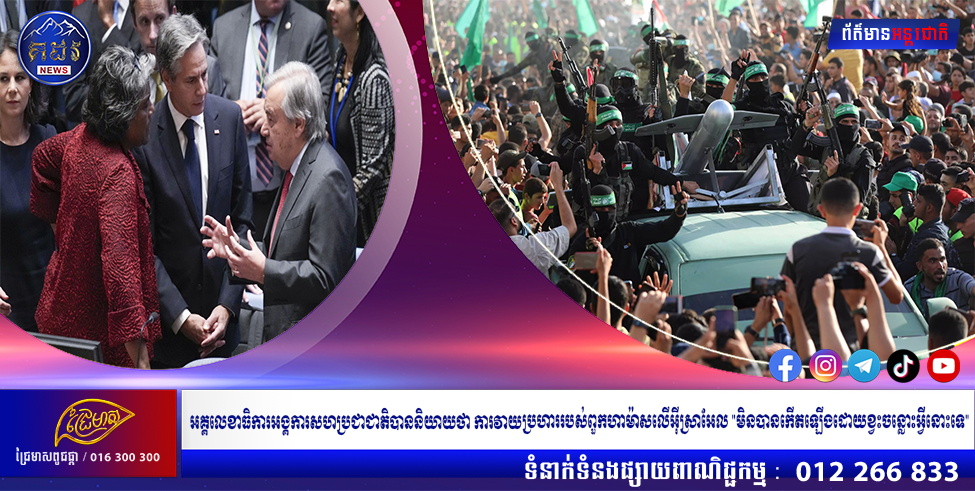 អគ្គលេខាធិការអង្គការសហប្រជាជាតិ លោក Antonio Guterres បាននិយាយថា ការវាយប្រហារកាលពីថ្ងៃទី 7 ខែតុលា របស់ក្រុមហាម៉ាស ទៅលើអ៊ីស្រាអែល”មិនបានកើតឡើងដោយខ្វះចន្លោះ”ក្នុងអំឡុងពេលសុន្ទរកថារបស់គាត់ទៅកាន់ក្រុមប្រឹក្សាសន្តិសុខនៅមជ្ឈិមបូព៌ាកាលពីថ្ងៃអង្គារ។“វាមានសារៈសំខាន់ផងដែរក្នុងការទទួលស្គាល់ការវាយប្រហារដោយក្រុមហាម៉ាសមិនបានកើតឡើងនៅក្នុងកន្លែងទំនេរមួយ។ លោក Guterres បាននិយាយថា ប្រជាជនប៉ាឡេស្ទីនបានទទួលរងនូវការកាន់កាប់រយៈពេល 56 ឆ្នាំដោយថប់ដង្ហើម។ លោក Guterres បាននិយាយថា ប្រជាជនប៉ាឡេស្ទីន “បានឃើញទឹកដីរបស់ពួកគេត្រូវបានលេបត្របាក់ឥតឈប់ឈរដោយការតាំងទីលំនៅ និងញាំញីដោយអំពើហិង្សា”។