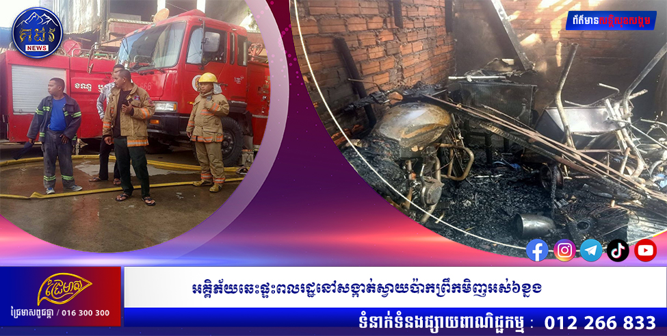 ផ្ទះប្រជាពលរដ្ឋចំនួន៦ខ្នងត្រូវបានអគ្គិភ័យឆាបឆេះគ្មានសល់បង្កការភ្ញាក់ផ្អេីលដល់ប្រជាពលរដ្ឋ និងសមត្ថកិច្ច ក្រុមរថយន្តពន្លត់អគ្គិភ័យចុះមកអន្តរាគមន៍កាលពីវេលាម៉ោង០៦និ៣០នាទីព្រឹក ថ្ងៃទី១៦ ខែវិច្ឆិកា ឆ្នាំ២០២២ នៅភូមិឡរកំបោរ សង្កាត់ស្វាយប៉ាក ខណ្ឌឬស្សីកែវ រាជធានីភ្នំពេញ។