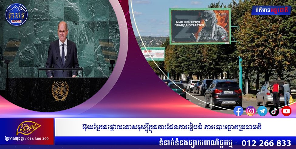 (កៀវ)៖ អ៊ុយក្រែន និងបណ្ដាប្រទេសលោកខាងលិច បានថ្កោលទោសយ៉ាងខ្លាំងចំពោះផែនការរៀបចំការបោះឆ្នោតប្រជាមតិលេបយកទឹកដីអ៊ុយក្រែន ពីសំណាក់ ក្រុមមន្ត្រីដែលលើកបន្តុបដោយទីក្រុងមូស្គូ នៅតាមតំបន់ដែលកំពុងស្ថិតនៅក្រោមការគ្រប់គ្រងដោយកងទ័ពរុស្ស៉ី។ នេះបើតាមការចេញផ្សាយ ដោយទីភ្នាក់ងារសារព័ត៌មាន Reuters នៅថ្ងៃពុធ ទី២១ ខែកញ្ញា ឆ្នាំ២០២២។