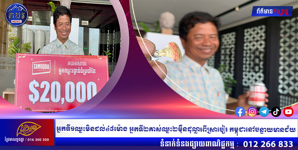 សំណាងពិតជាមើលមិនឃើញមែន! មិនទាន់បានប៉ុន្មានថ្ងៃផង ក្រោយពីរកឃើញអ្នកឈ្នះរង្វាន់ធំទី១ ទឹកប្រាក់២ម៉ឺនដុល្លារពីស្រាបៀរ កម្ពុជា ក៏ស្រាប់តែបានរកឃើញបុរសកំពូលសំណាងម្នាក់ទៀតដែលគាស់ត្រូវរង្វាន់២ម៉ឺនដុល្លារ។