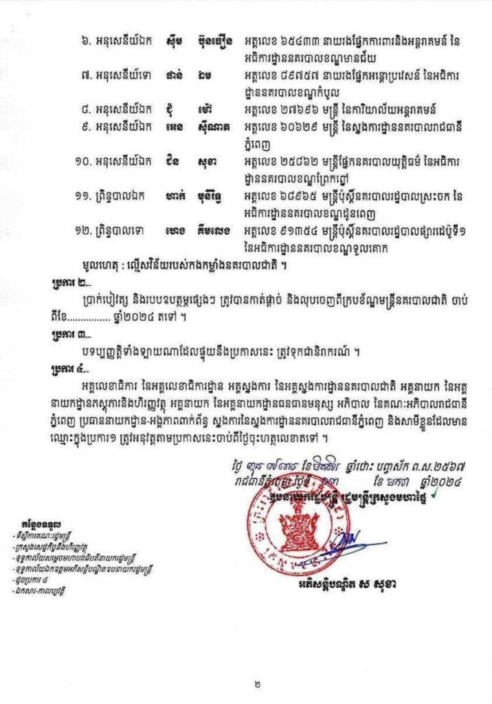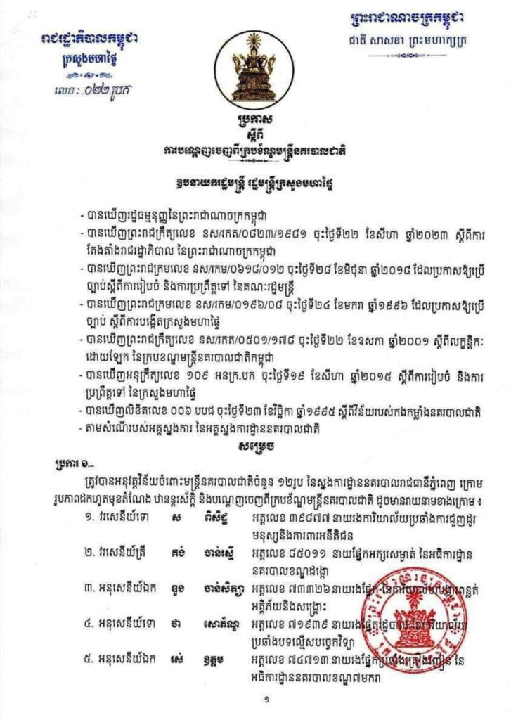 (ភ្នំពេញ)៖ ឧបនាយករដ្ឋមន្ត្រី ស សុខា រដ្ឋមន្ត្រីក្រសួងមហាផ្ទៃ នៅថ្ងៃទី៥ ខែមករា ឆ្នាំ២០២៤ បានចេញសេចក្តីសម្រេច បណ្តេញមន្ត្រីនគរបាលជាតិ នៃស្នងការដ្ឋាននគរបាលរាជធានីភ្នំពេញចំនួន ១២នាក់ ចេញពីក្របខ័ណ្ឌ ដោយសារល្មើសវិន័យរបស់កងកម្លាំងនគរបាលជាតិ។