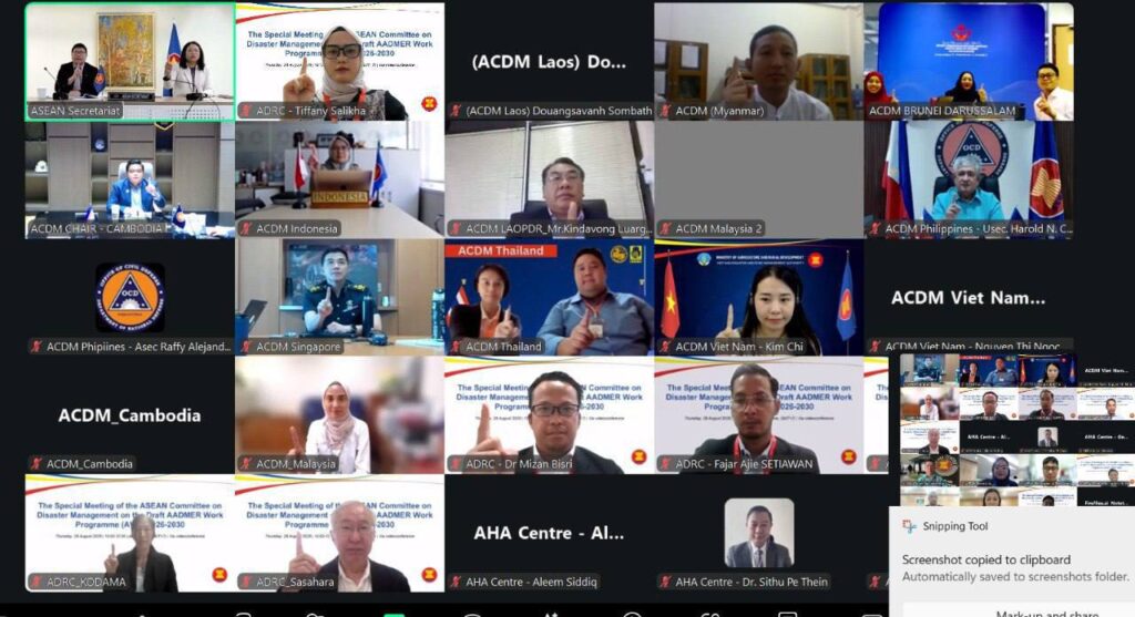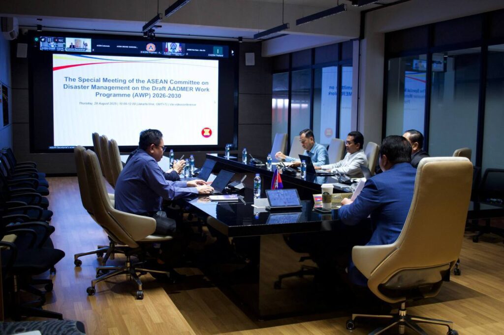 [ភ្នំពេញ] នៅព្រឹក ថ្ងៃទី២៨ ខែសីហា ឆ្នាំ២០២៥ ឯកឧត្តម គីម វីរៈ អគ្គលេខាធិការ នៃគណៈកម្មាធិការជាតិគ្រប់គ្រងគ្រោះមហន្តរាយ ក្នុងនាមជាប្រធានគណៈកម្មាធិការគ្រប់គ្រងគ្រោះមហន្តរាយអាស៊ាន (ACDM) បានដឹកនាំមន្ត្រីជាន់ខ្ពស់ និងមន្ត្រីបច្ចេកទេស គ.ជ.គ.ម. ចូលរួមកិច្ចប្រជុំពិសេស របស់គណៈកម្មការ គ្រប់គ្រងគ្រោះមហន្តរាយអាស៊ាន ស្តីពីពង្រាងកម្មវិធីការងារអាត់ម៉ែរថ្មី ឆ្នាំ២០២៦-២០៣០ (AADMER Work Programme 2026-2030) តាមប្រព័ន្ធអនឡាញ។