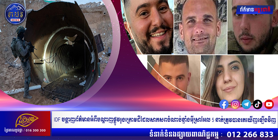 កងកម្លាំងការពារអ៊ីស្រាអែល (IDF) កាលពីថ្ងៃអាទិត្យ បានបង្ហាញព័ត៌មានថ្មីអំពីបណ្តាញផ្លូវរូងក្រោមដីរបស់ក្រុមហាម៉ាស់ ដែល IDF បាននិយាយថា ខ្លួនបានកម្ទេចនាពេលថ្មីៗនេះ បន្ទាប់ពីការស្រង់សាកសពចំណាប់ខ្មាំងអ៊ីស្រាអែលប្រាំនាក់មកវិញ។ចំណាប់ខ្មាំង ដែលទូរទស្សន៍ CNN បានរាយការណ៍កាលពីពាក់កណ្តាលខែធ្នូ មានដូចជា៖ Ziv Dado, Eden Zecharya, Ron Sherman, Nik Beizer និង Elia Toledano ។Zecharya និង Toledano គឺជាជនស៊ីវិល Dado, Sherman និង Beizer គឺជាទាហាន IDF ។