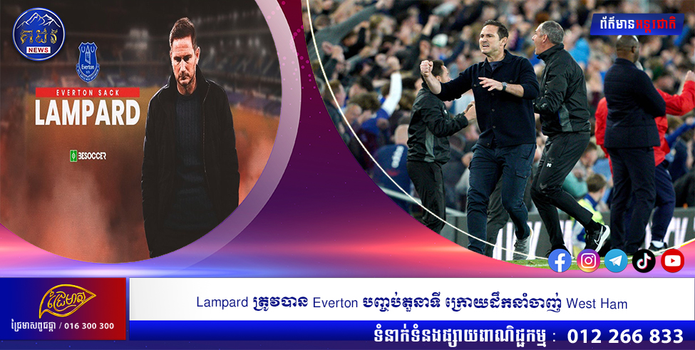 (ក្រុងឡុងដ៍)៖ លោក Frank Lampard ត្រូវបានក្លិបស្ករគ្រាប់ Everton បណ្តេញចេញពីតំណែងគ្រូបង្វឹកជាផ្លូវការហើយ ក្រោយដឹកនាំលេងចាញ់ក្រុមញញួរធំ West Ham United នៅ Premier League កាលពីរាត្រីថ្ងៃសៅរ៍។