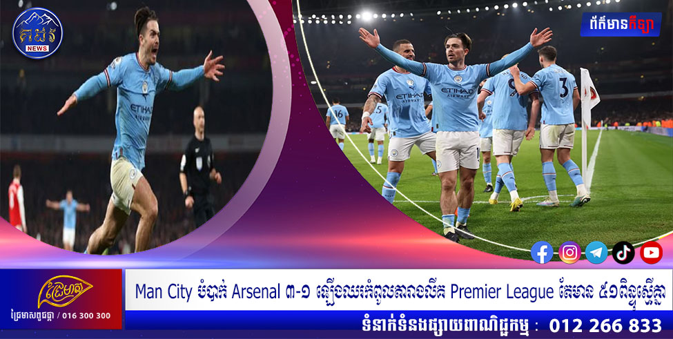 Man City បំបាក់ Arsenal ៣-១ ឡើងឈរកំពូលតារាងលីគ Premier League តែមាន ៥១ពិន្ទុស្មើគ្នា