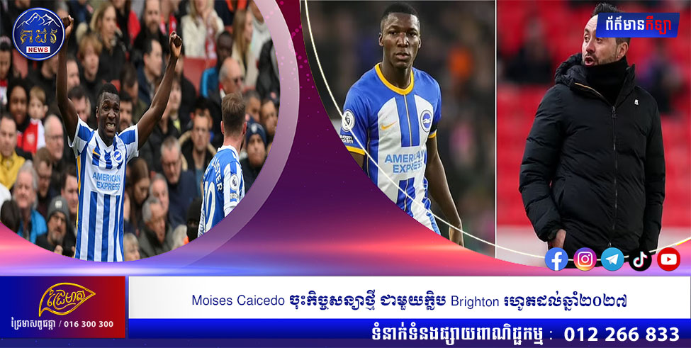 (ឡុងដ៍)៖ ខ្សែបម្រើក្លិប Brighton & Hove Albion កីឡាករ Moises Caicedo បានចុះកិច្ចសន្យាថ្មី រហូតដល់ឆ្នាំ២០២៧ ជាមួយក្លិបអមដោយជម្រើសបន្ថែមមួយឆ្នាំទៀត, នេះបើយោងតាមសារព័ត៌មាន BBC ចេញផ្សាយនៅថ្ងៃទី០៥ ខែមីនា ឆ្នាំ២០២៣។