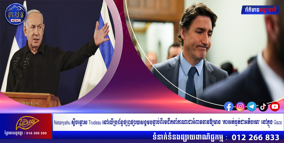 នាយករដ្ឋមន្ត្រីអ៊ីស្រាអែល លោក Benjamin Netanyahu បានប្រើប្រព័ន្ធផ្សព្វផ្សាយសង្គមកាលពីថ្ងៃពុធ ដើម្បីស្តីបន្ទោសសមភាគីកាណាដាលោក Justin Trudeau បន្ទាប់ពីលោកបានជំរុញឱ្យអ៊ីស្រាអែលបង្ហាញ “ការអត់ធ្មត់ជាអតិបរមា” នៅក្នុងប្រតិបត្តិការយោធារបស់ខ្លួននៅក្នុងតំបន់ហ្គាហ្សា។