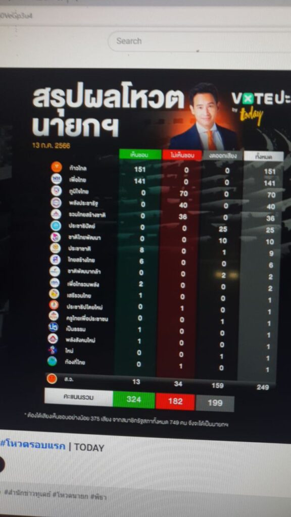 សម័យប្រជុំរួមនៃរដ្ឋសភានិងព្រឹទ្ធសភាថៃ ត្រូវបានបើកធ្វើឡើង ដើម្បីជ្រើសរើសនាយករដ្ឋមន្រ្តីថ្មី ក្រោយការបោះឆ្នោតសកលកាលពីខែឧសភាកន្លងទៅ។ លទ្ធផលនៃការបោះឆ្នោតនៅក្នុងសភា បានបង្ហាញថា លោក Pita ដែលជា បេក្ខជនតែម្នាក់គត់ គឺទទួលបានសំឡេងគាំទ្រមិនគ្រាប់គ្រាន់ទេ បន្ទាប់ពីមានសំឡេងជំទាស់ និងអនុបវាទជាច្រើន ប្រឆាំងរូបលោក។