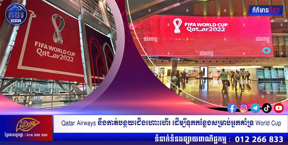 (ដូហា)៖ ក្រុមហ៊ុនអាកាសចរណ៍ Qatar Airways នឹងដកចេញនូវជើងហោះហើរមកពី ១៨គោលដៅ ដើម្បីទុកកន្លែងនៅឯអាកាសយានដ្ឋាន Hamad International Airport សម្រាប់ក្រុមហ៊ុនអាកាសចរណ៍ ដឹកអ្នកគាំទ្រមកចូលរួមក្នុងព្រឹត្តិការណ៍បាល់ទាត់ពិភពលោក World Cup នៅខែក្រោយ។ នេះបើតាមការបញ្ជាក់ពី CEO របស់ក្រុមហ៊ុន ហើយត្រូវបានចុះផ្សាយដោយសារព័ត៌មាន CNA នាថ្ងៃទី១៩ ខែតុលា ឆ្នាំ២០២២។