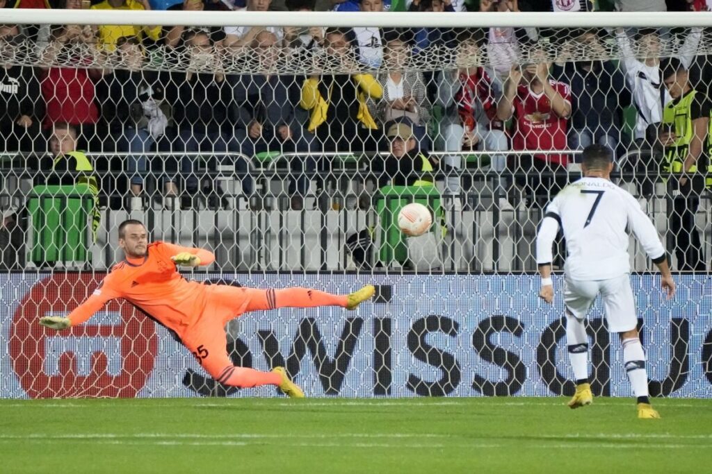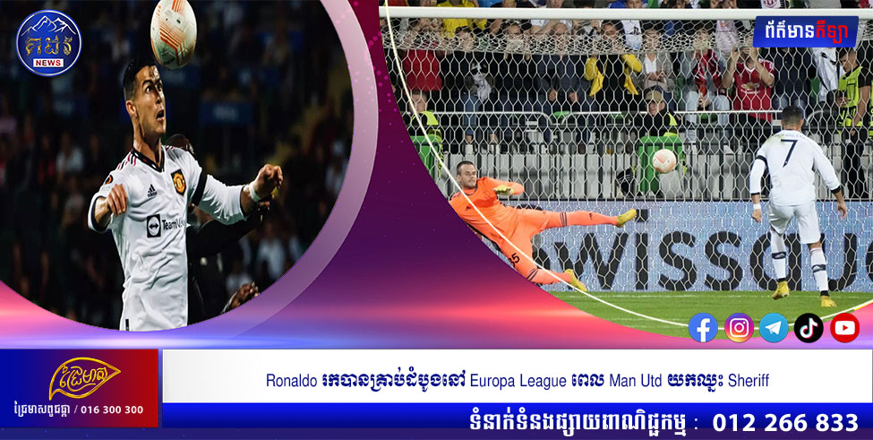 (បរទេស)៖ Cristiano Ronaldo រកបានគ្រាប់ដំបូងនៅពានលំដាប់ទី២ អឺរ៉ុប UEFA Europa League ក្នុងជំនួបដែល Manchester United យកឈ្នះម្ចាស់ផ្ទះ Sheriff Tiraspol នៃវគ្គសន្សំពិន្ទុលើកទី២ ប្រចាំពូល E នារាត្រីថ្ងៃព្រហស្បតិ៍ ទី១៥ ខែកញ្ញា ឆ្នាំ២០២២ (ម៉ោងនៅកម្ពុជា)។