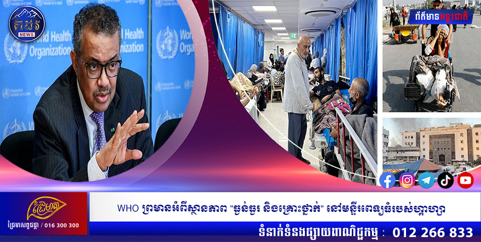 អង្គការសុខភាពពិភពលោកបានព្រមានអំពីស្ថានភាព “ធ្ងន់ធ្ងរ និងគ្រោះថ្នាក់” នៅឯកន្លែងព្យាបាលដ៏សំខាន់របស់ហ្គាហ្សា គឺមន្ទីរពេទ្យ Al-Shifa ដែលកំពុងជួបប្រទះនឹងការដាច់ចរន្តអគ្គិសនីជិតពេញលេញ និងកង្វះអាហារ និងទឹក។