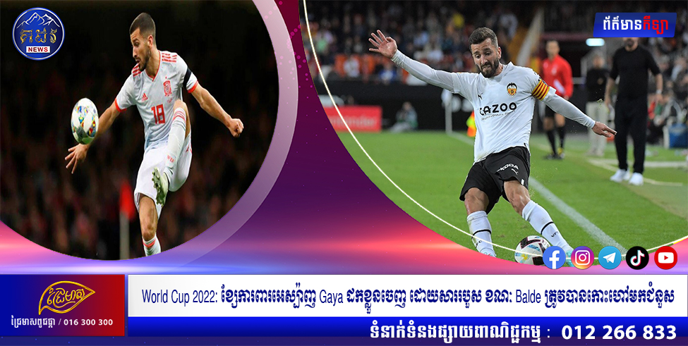 (ម៉ាទ្រីដ)៖ ខ្សែការពារឆ្វេងអេស្ប៉ាញ Jose Gaya បានដកខ្លួនចេញពីក្រុមជម្រើសជាតិរបស់ពួកគេ សម្រាប់ការប្រកួតក្នុងព្រឹត្តិការណ៍ World Cup នៅប្រទេសកាតា បន្ទាប់ពីរងរបួសកជើងនៅក្នុងការហ្វឹកហាត់។ នេះបើតាមការប្រកួតពីក្រុម ហើយត្រូវបានចុះផ្សាយដោយសារព័ត៌មាន CNA នាថ្ងៃទី១៩ ខែវិច្ឆិកា ឆ្នាំ២០២២។